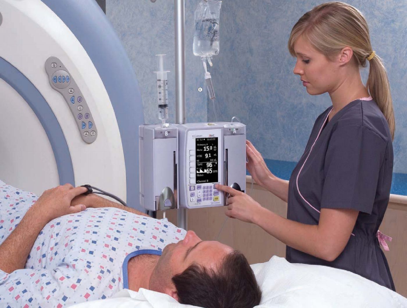 Administración de líquido por hasta dos canales, cada uno con velocidad y VTBI programables por separado para primaria/secundaria, en líneas IV individuales o separadas.