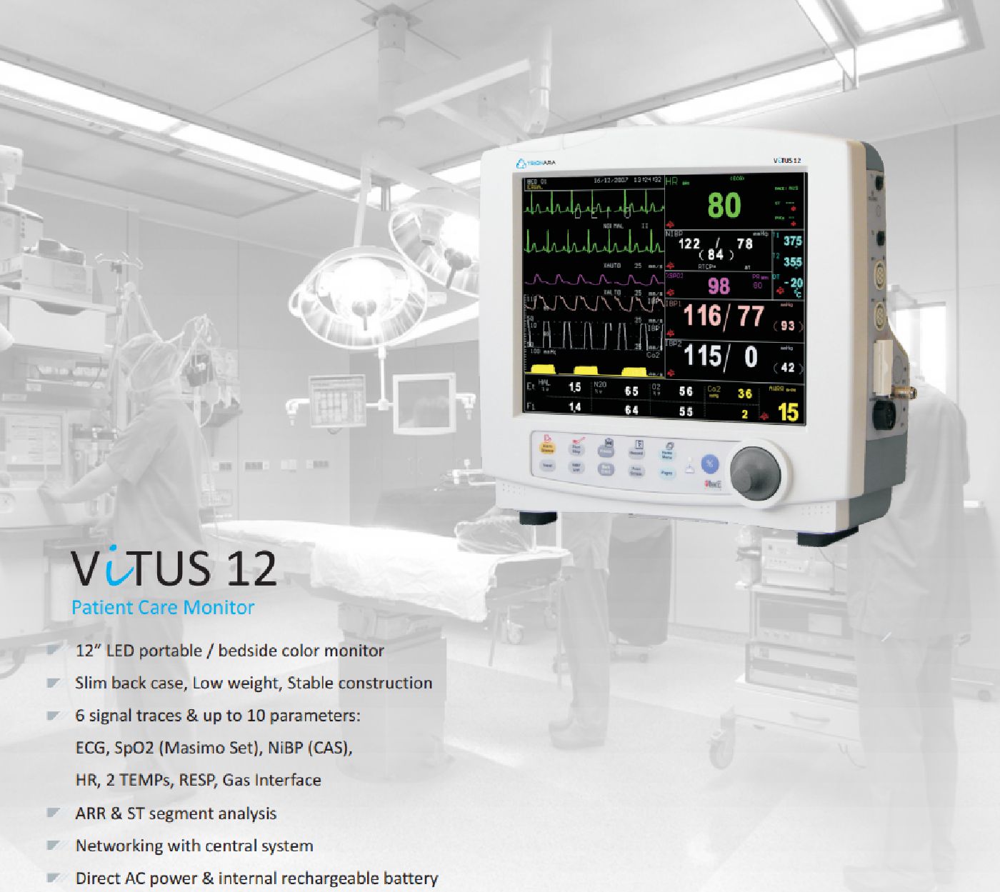 Parámetros: ECG de 3 o 5 leads, Saturación de oxigeno tecnología Masimo de USA., Respiración, Dos canales de presión invasiva (Puertos Activos, CABLES No incluidos), Presión no invasiva, Dos canales de temperatura.