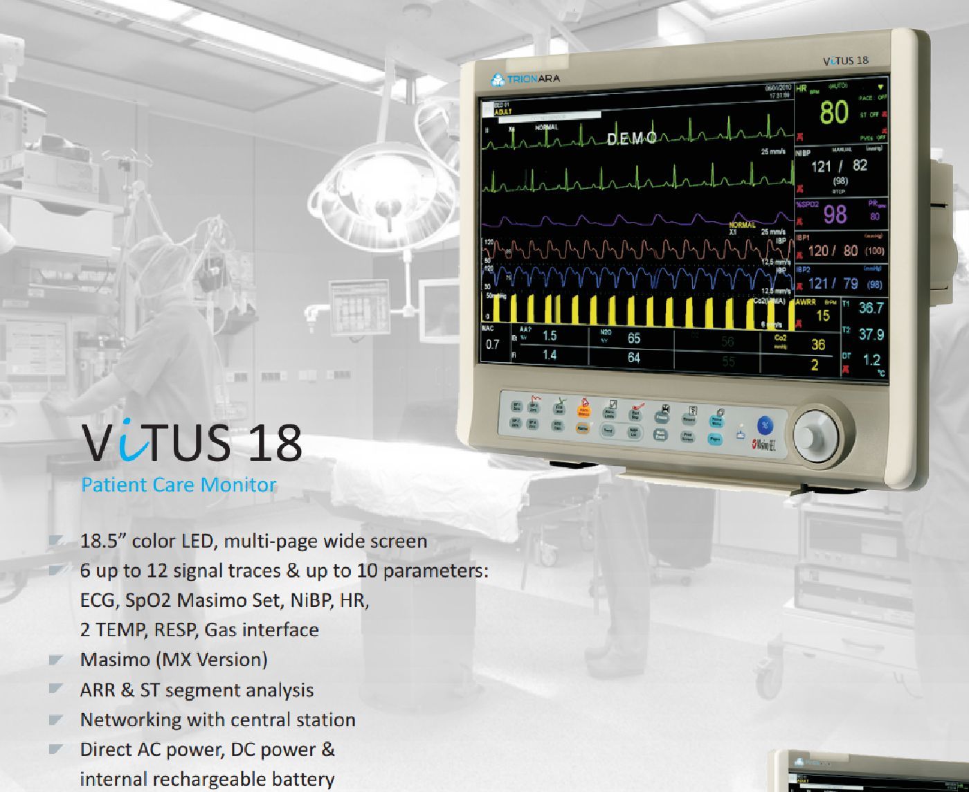Parámetros: ECG, Saturación de oxígeno, Respiración, Temperatura, presión no invasiva, dos canales de presión invasiva, dos canales de temperatura, capnografía por método “mainstream” con medición e identificación de 5 gases anestésicos (Opcional).